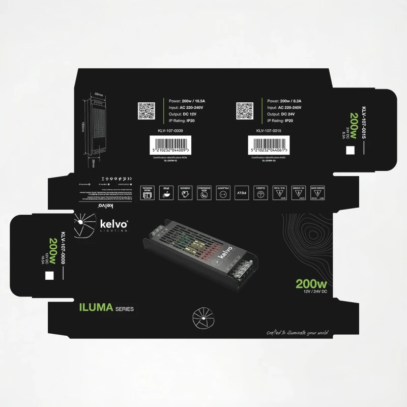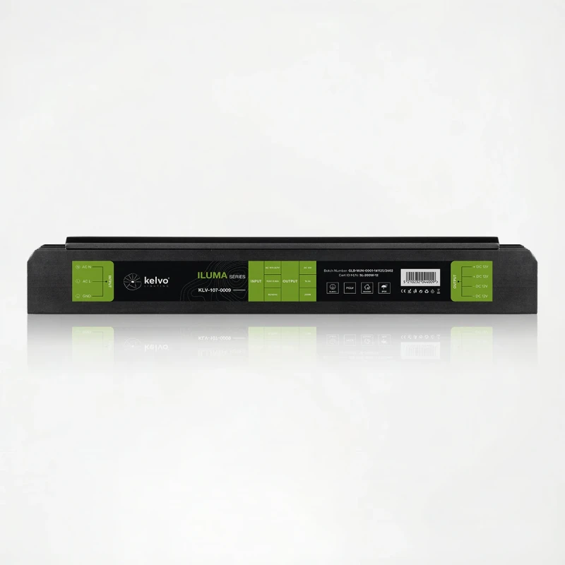 kelvo® ILUMA KLV-107-0009 Slim Τροφοδοτικό/Μετασχηματιστής Class I PELV 200W 16.5A AC 220-240V σε DC 12V IP20 - Γκρι Ανθρακί Ματ - Μ18.5 x Π5.9 x Υ2.8cm - 5 Χρόνια Εγγύηση
