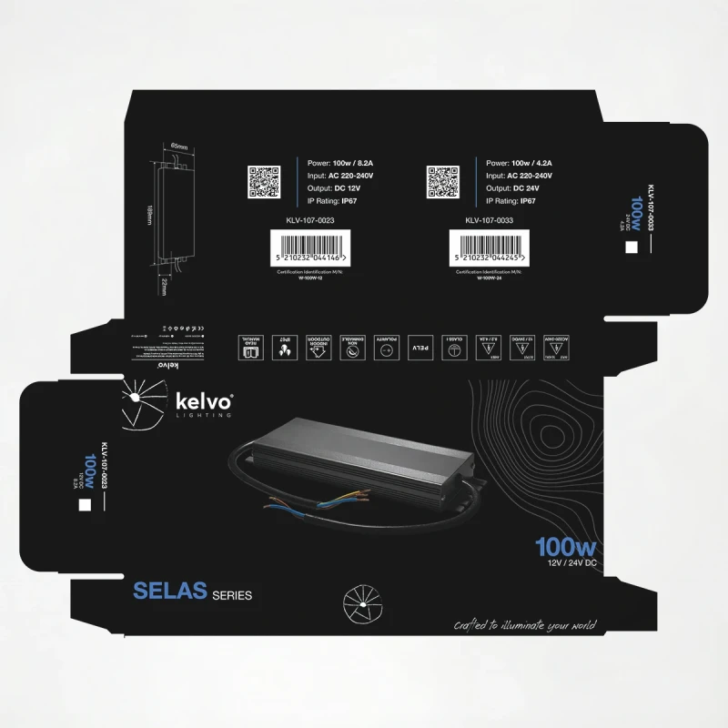 kelvo® SELAS KLV-107-0023 Τροφοδοτικό/Μετασχηματιστής Class I PELV 100W 8.2A AC 220-240V σε DC 12V Αδιάβροχο IP67 - Γκρι Ανθρακί Ματ - Μ18.9 x Π6.5 x Υ2.2cm - 5 Χρόνια Εγγύηση
