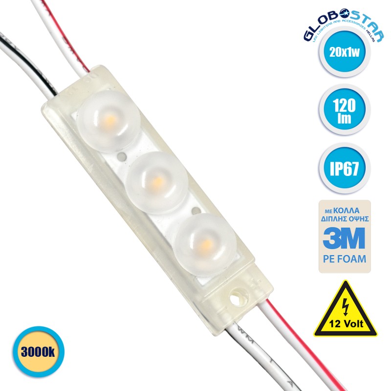 GloboStar® 73710 20 Τεμάχια x LED Modules 3 x SMD 3030 LUMILED LUXEON CHIP 1W 120lm DC 12V Αδιάβροχο IP67 Θερμό Λευκό 3000K